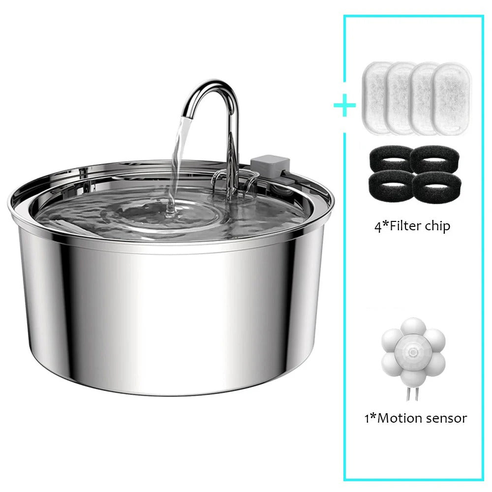 Excellent, well functioning, all in steel, complete with the essential motion sensor. Starts and stops the delivery when the cat near the sensor passes. Erosion lasted about 30/40 seconds, perfect for my cat's drinking needs.